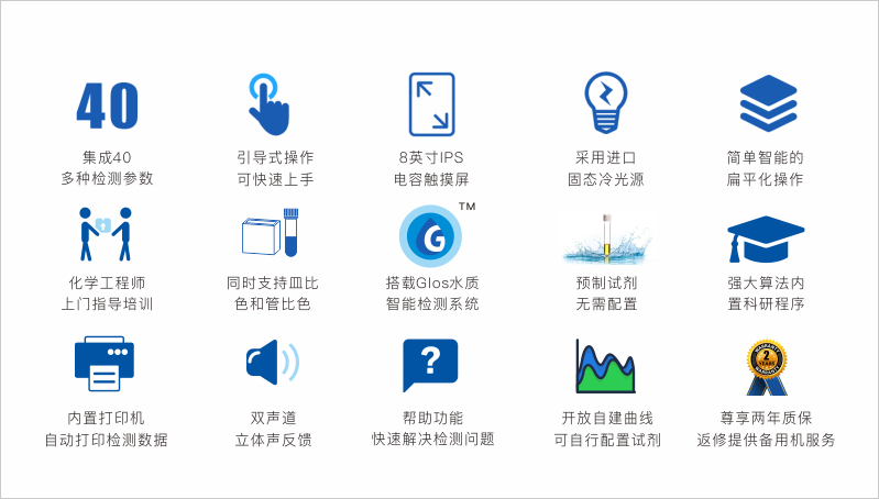 •搭载Glos⽔质智能检测系统、全自动每秒⼏⼗次的数据均化计算。