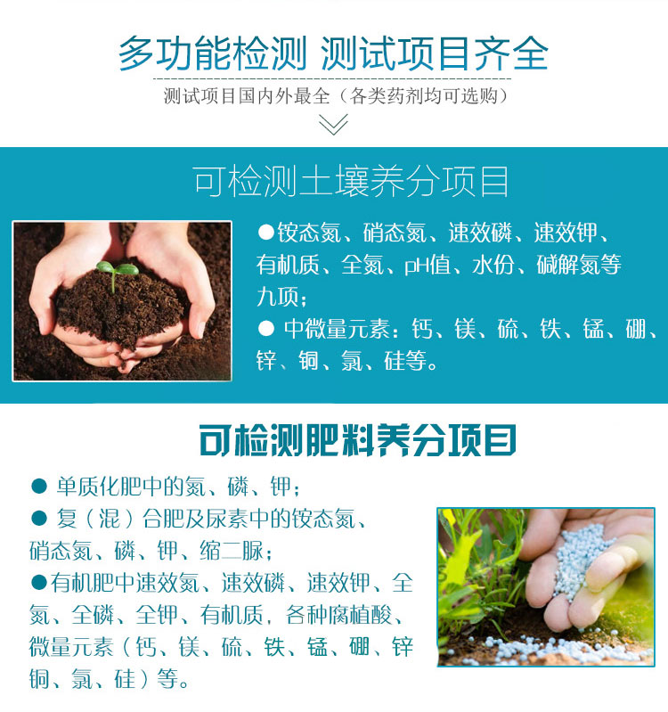 减少了传统施肥造成的环境污染,农民对科学技术的改进越来越迫切,土壤检测仪器实现了玉米生产的大规模收获,所有检测项目都能实现各通道的同时检测,大大提高检测效率,降低检测成本,内建植物营养诊断标准图,根据各作物营养缺乏图片,叶面对面对比,诊断丰富,